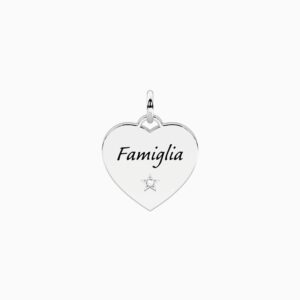 Descrizione prodotto Ciondolo cuore in acciaio satinato con critallo stella. Sul fronte scritta “Famiglia” e retro “Dove il cuore vive” • Dimensione ciondolo: 15×15,2 mm • Diametro cristalli: 1,25 mm • Materiale: Acciaio 316L, Cristalli Garanzia e Sicurezza Le immagini … Leggi altro -