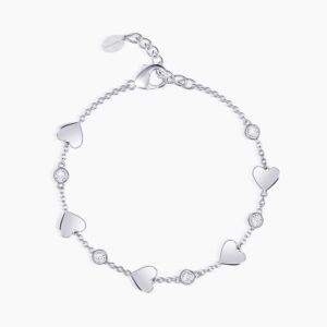Bracciale tennis con cuori lucidi in argento alternati a pietre taglio cuore.533633 • Incastonatura degli zirconi a castone• Dimensione degli zirconi: 3 x 3 mm• Chiusura a pinza con molla• Misura medium, lunghezza 18 cm• Materiale: Argento 925, Zirconi Cura … Leggi altro -