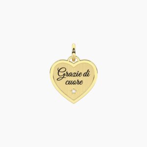 Descrizione prodotto Un grazie sincero è la parola migliore, se detta ad alta voce dal profondo del cuore. Ciondolo a forma di cuore in acciaio e PVD giallo satinato e lucido con cristallo bianco e scritta “Grazie di cuore”. Retro … Leggi altro -