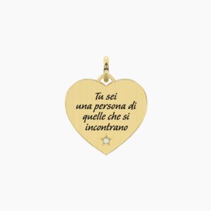 Descrizione prodotto Tu sei una persona di quelle che si incontrano quando la vita decide di farti un regalo.- Charles Dickens – Ciondolo a forma di cuore in acciaio e PVD giallo satinato con cristallo bianco e scritta “Tu sei … Leggi altro -