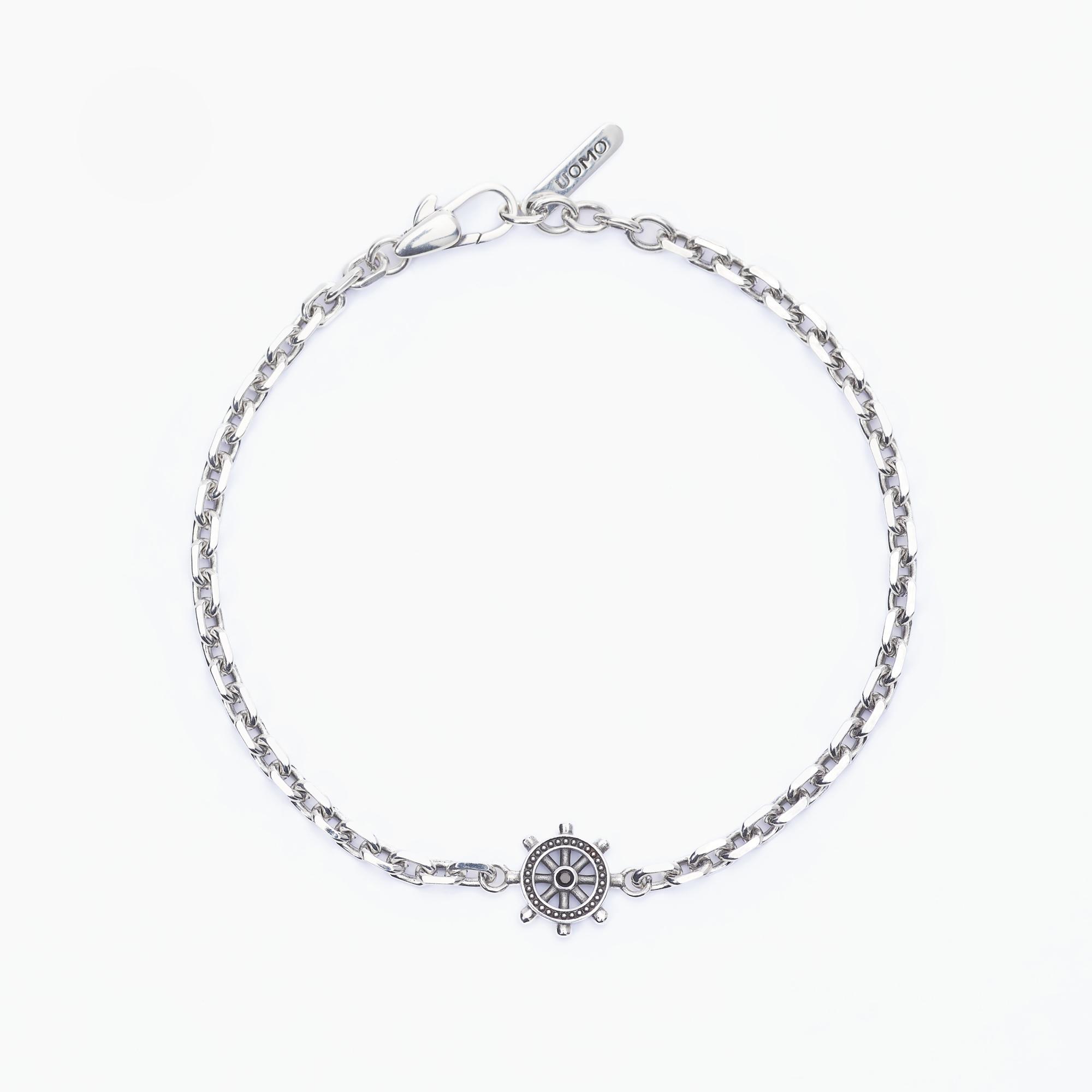 Bracciale a maglia forzatina in argento rodiato con piastra con elemento timone.