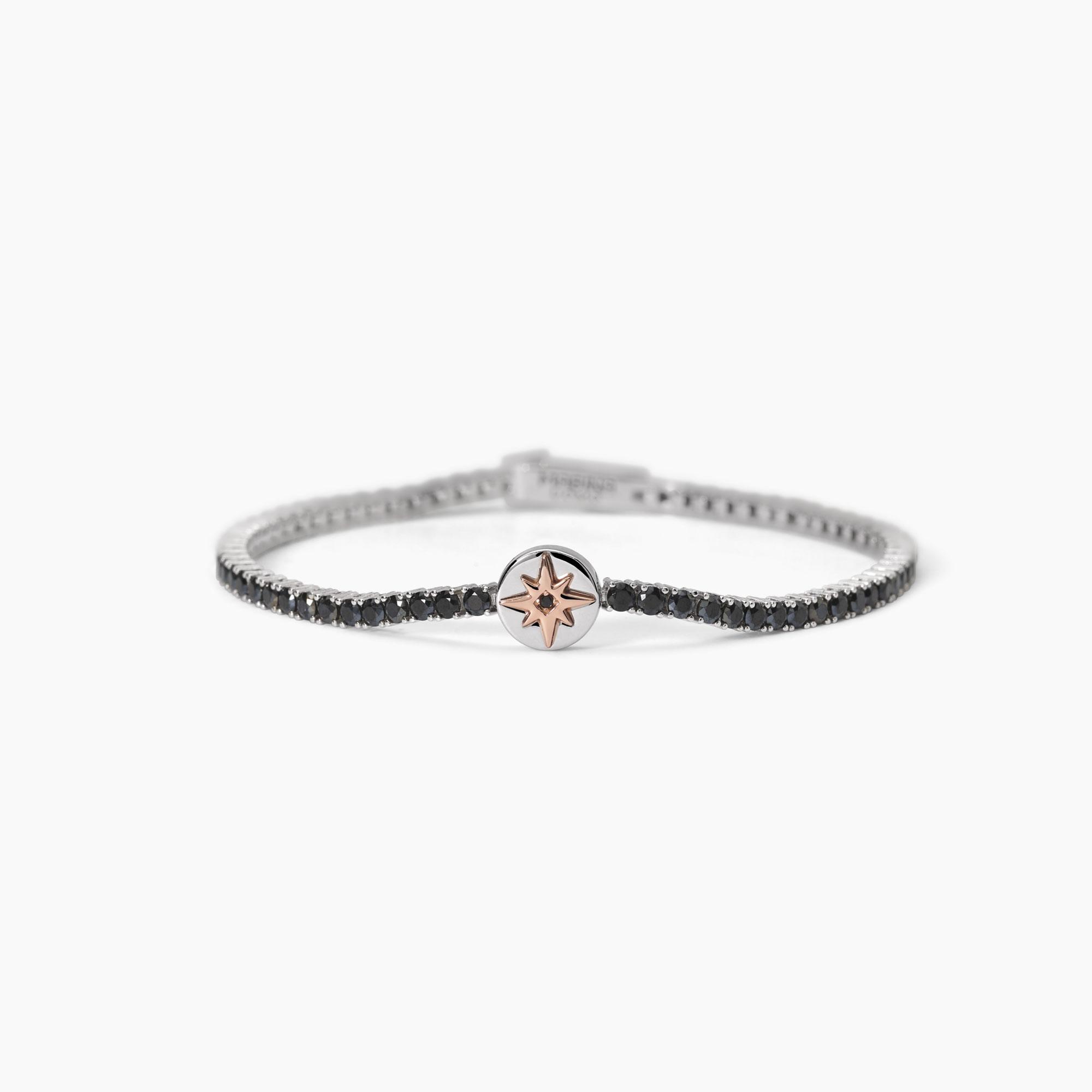 Bracciale da uomo modello tennis in argento rodiato con rosa dei venti placcata oro rosa 18k.