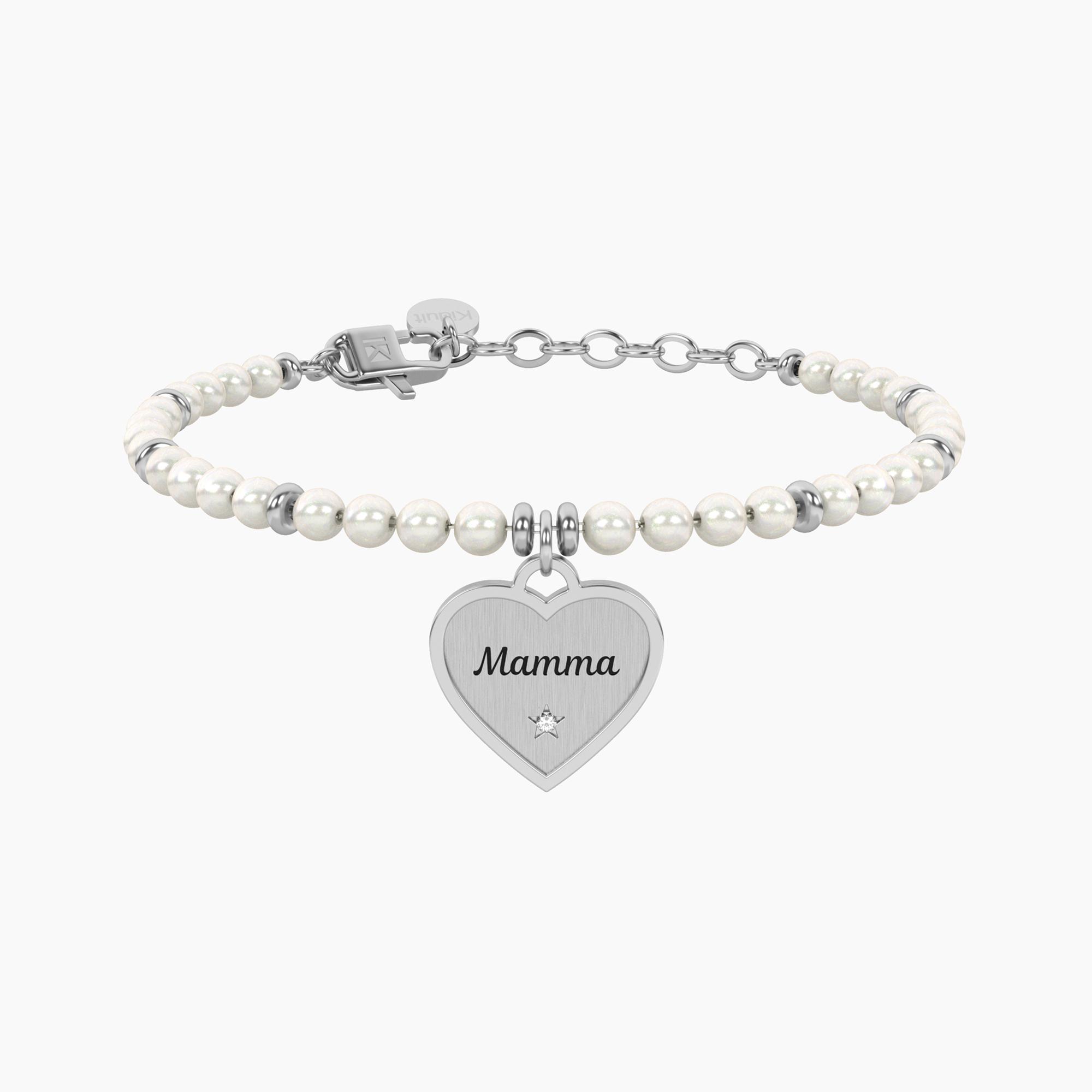 Bracciale da donna regolabile in acciaio lucido e satinato con perle conchiglia e ciondolo a forma di cuore con cristallo e scritta “Mamma” e sul retro “Non ti voglio perfetta, ti voglio felice!”.