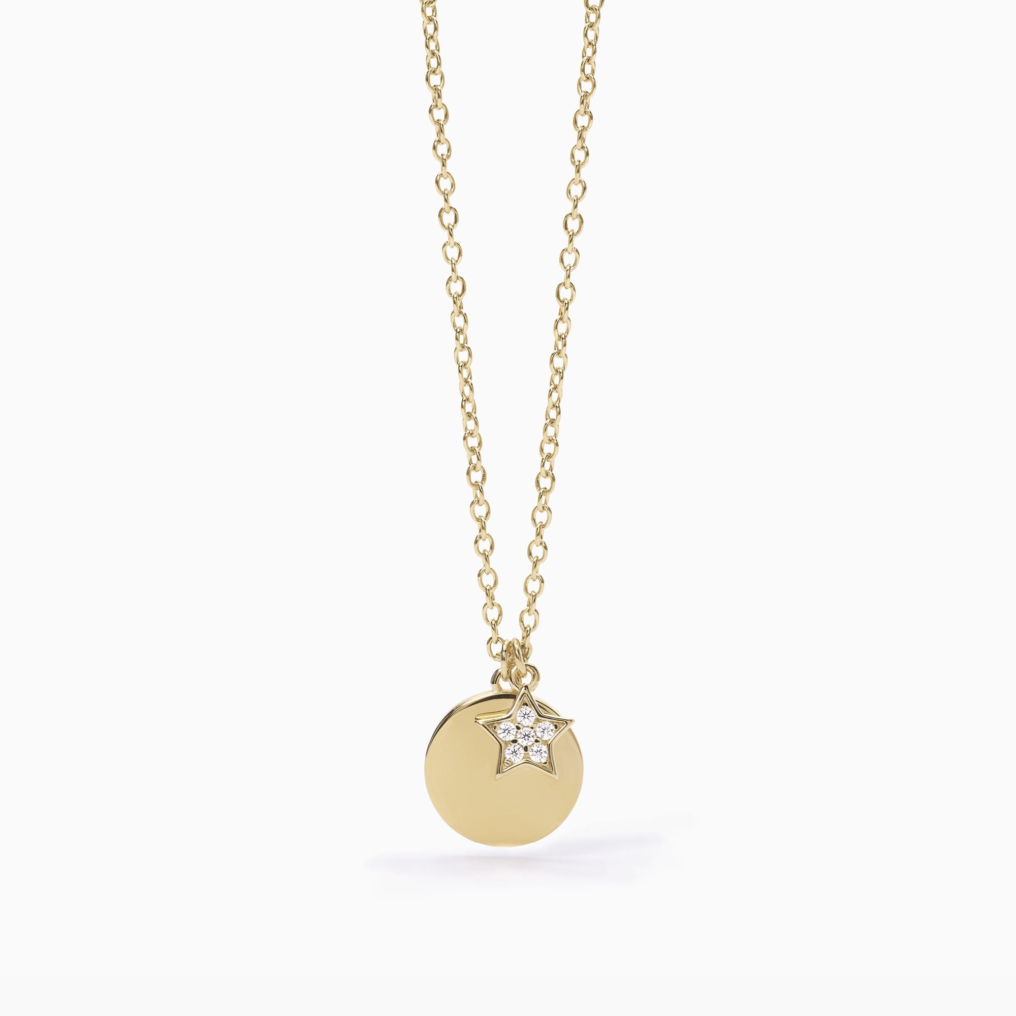 Girocollo in argento dorato con catena forzatina e due ciondoli: uno rotondo lucido e uno a forma di stella in pavé di zirconi bianchi.553508