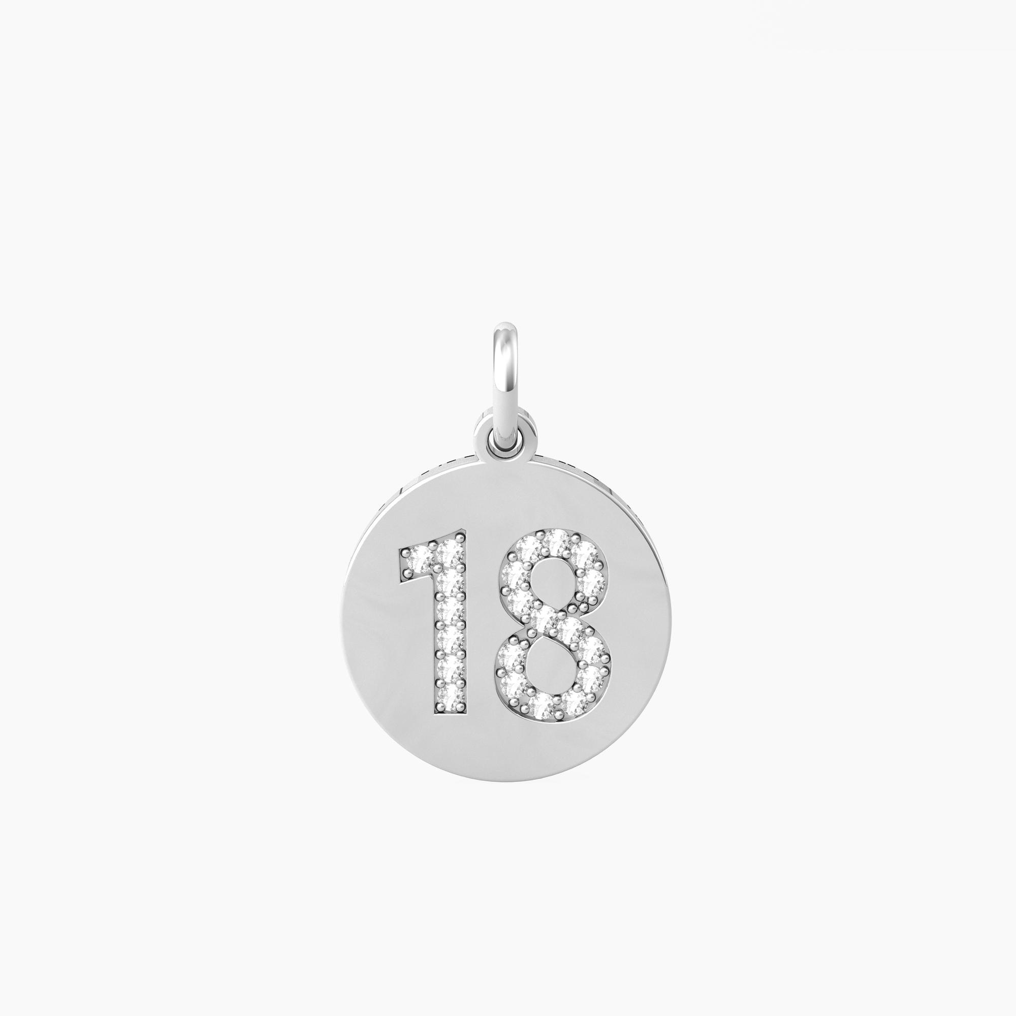 Ciondolo tondo in acciaio satinato e lucido con elemento a forma di numero 18 con cristalli bianchi e scritta “Make a wish”.
