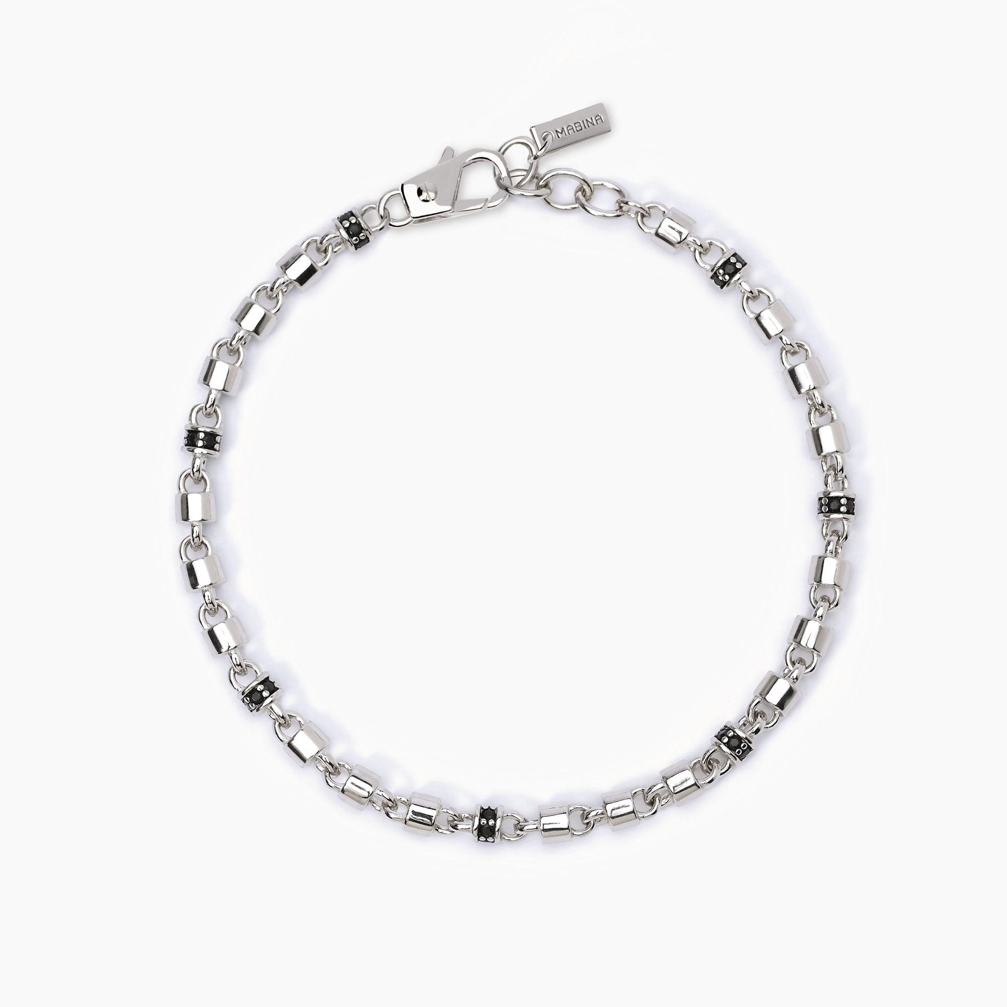 Bracciale in argento rodiato con maglia cilindri e inserti con zirconi neri.