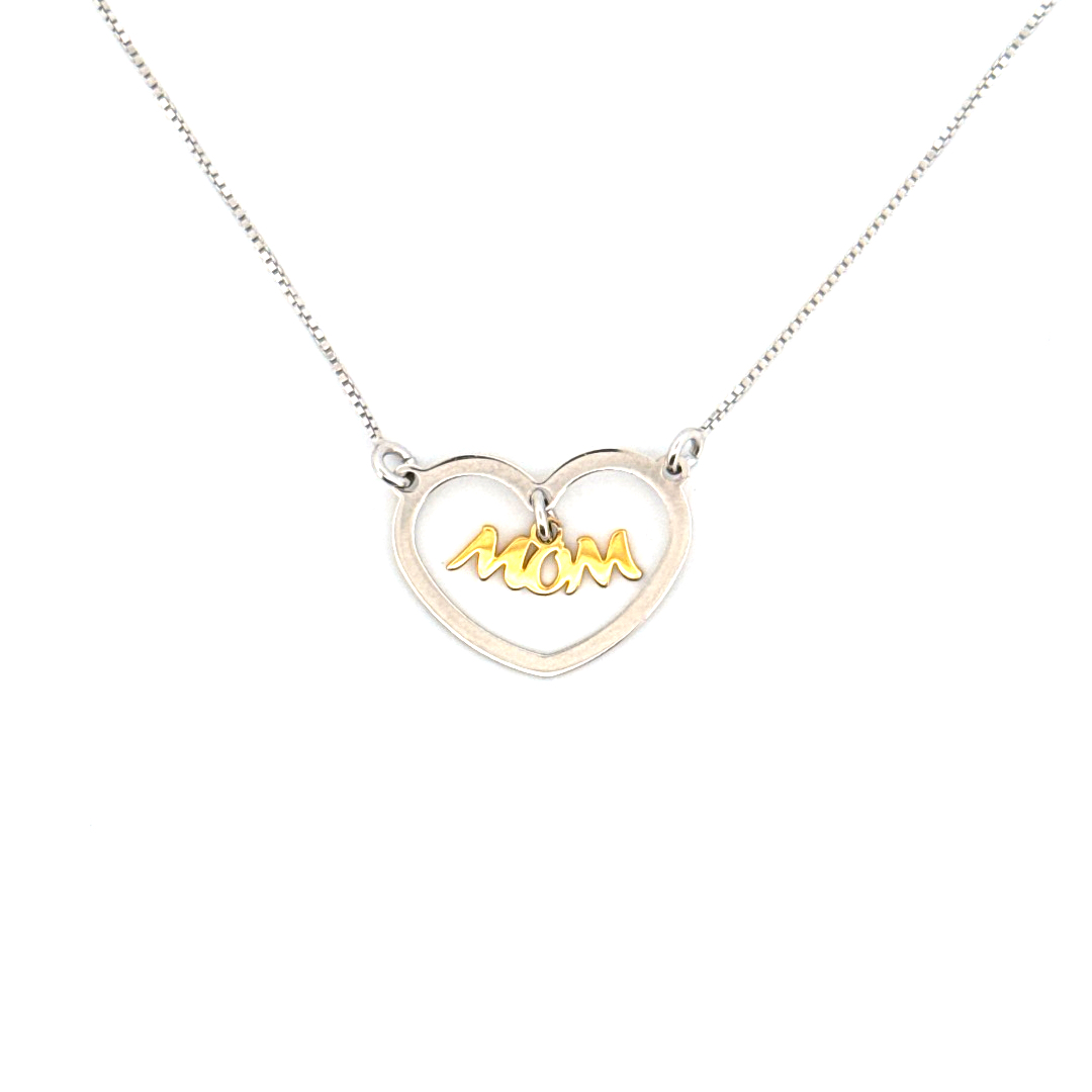 Collana a cuore con scritta MOM pendente. Catena in argento con ciondolo a forma di cuore in argento rodiato e scritta MOM in argento dorato. Rendi unico il tuo gioiello e non rinunciare mai al buon gusto.
