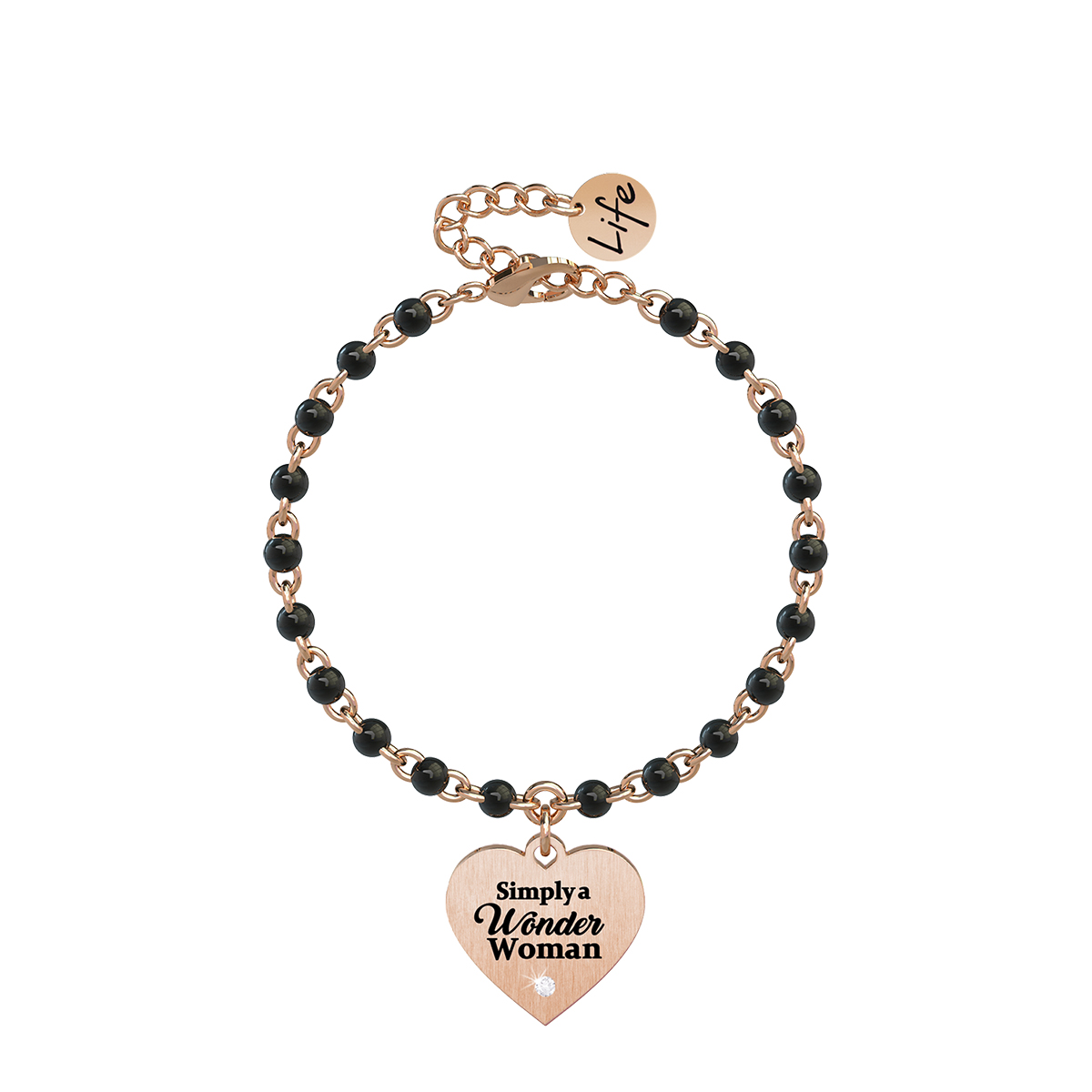 Bracciale in acciaio color oro rosa con ciondolo a cuore e catena rolò con inserimenti