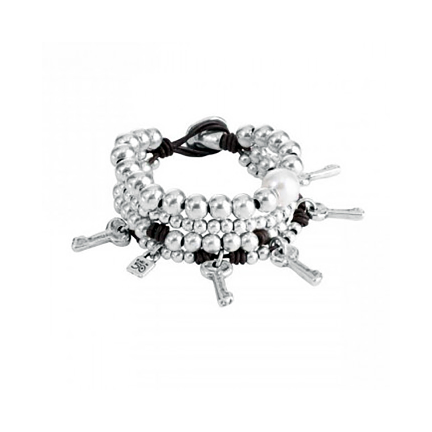 racciale da donna UNOde50 “En tu casa o en la mia” a più giri di cuoio con perle in metallo argentato, charms chiavi e perla. Lunghezza 17 cm.