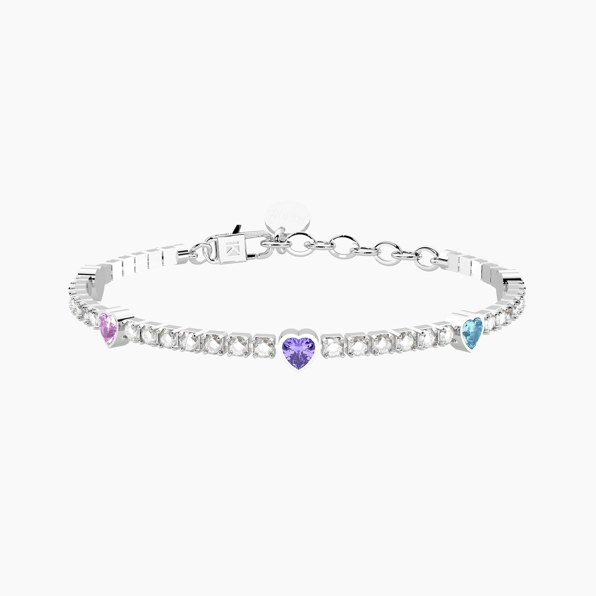 Bracciale regolabile in acciaio con tennis di cristalli e inserti cuore multicolor in zirconi.