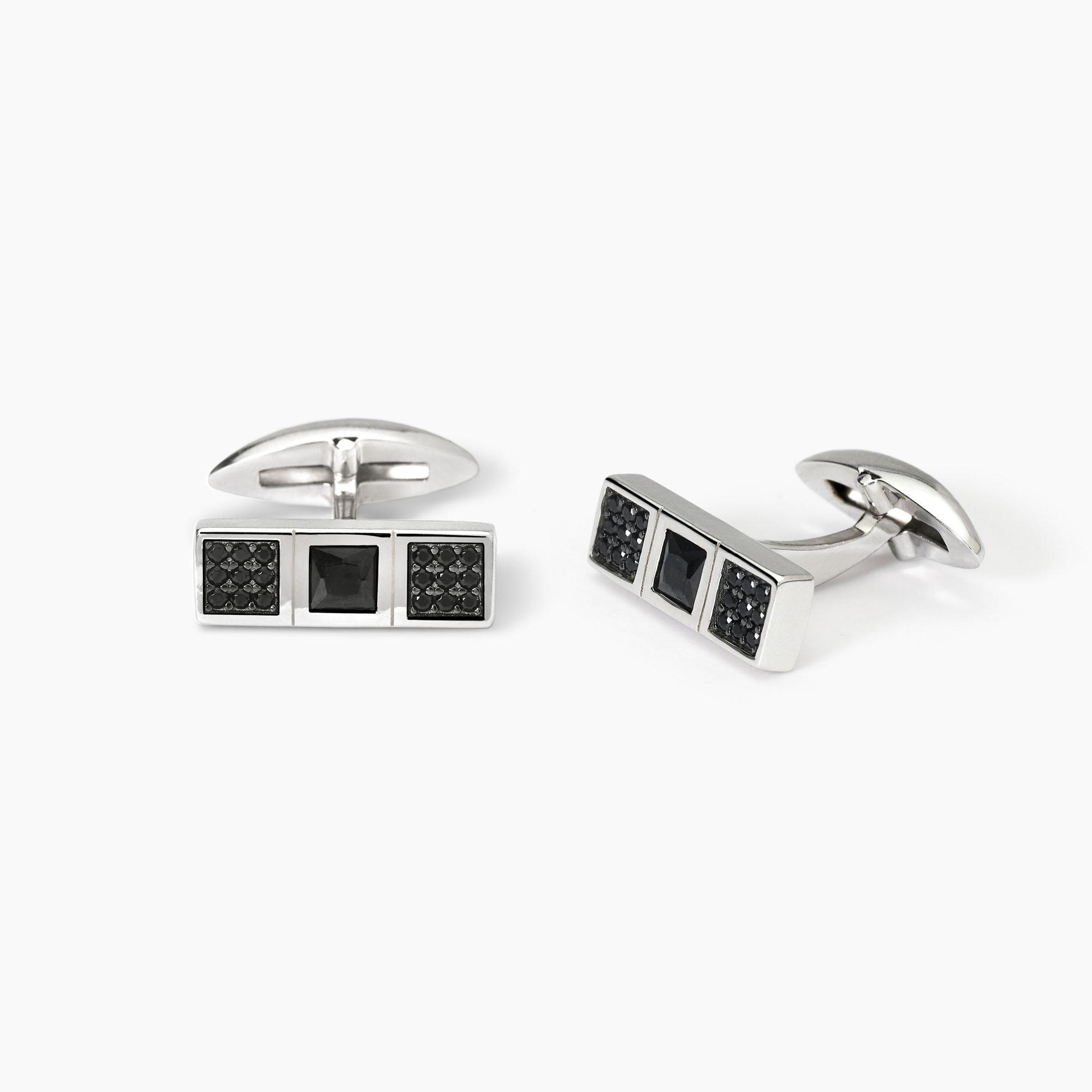 Gemelli uomo in argento a forma rettangolare con zircone nero centrale e pavé di zirconi a lato.