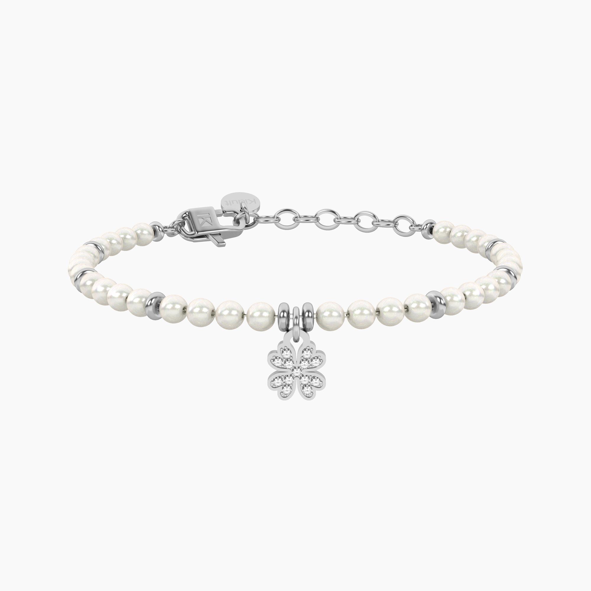Bracciale da donna regolabile in acciaio con perle conchiglia e ciondolo a forma di quadrifoglio con cristalli.